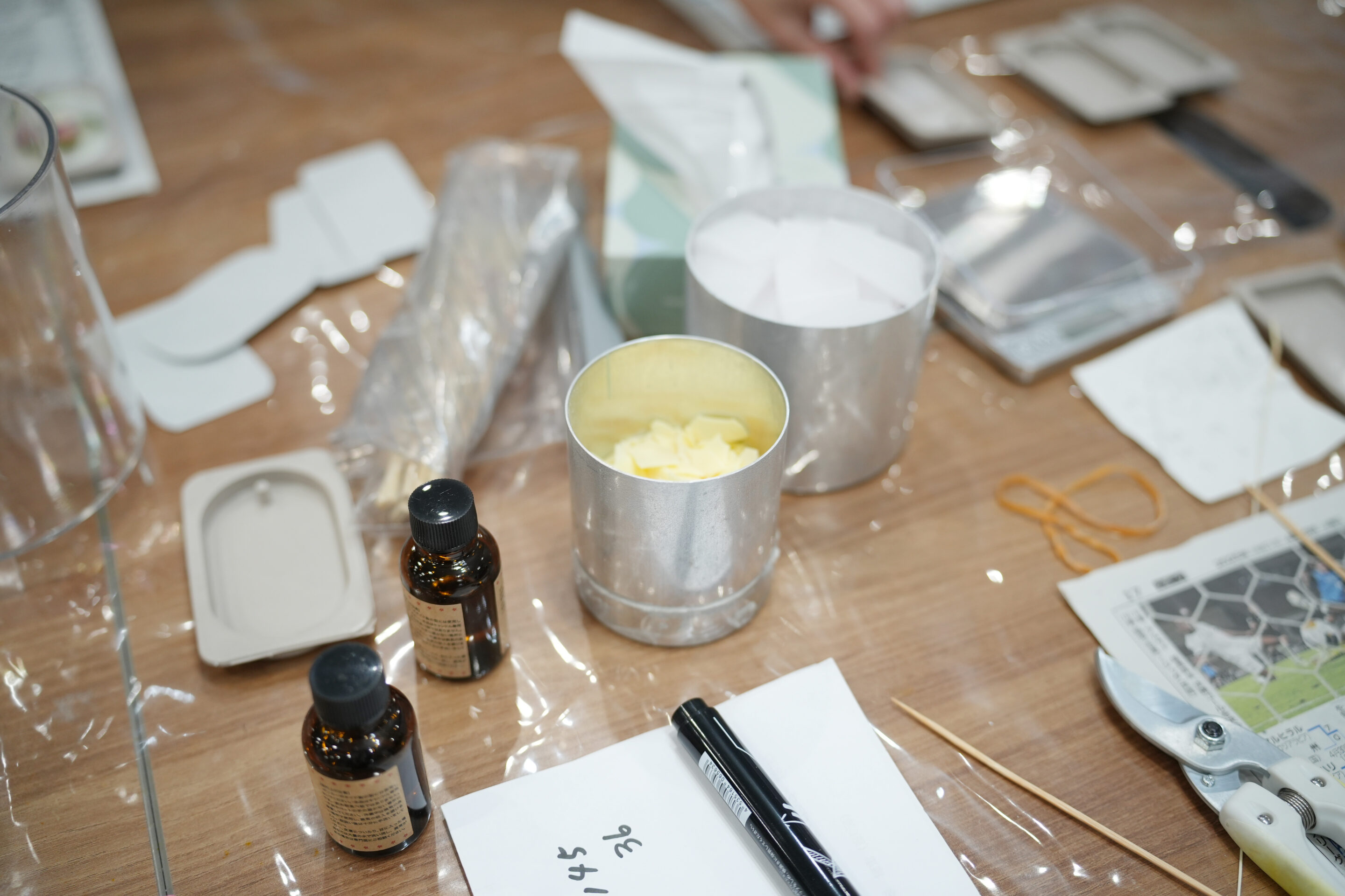 - ロウを溶かす用の道具や型が並ぶ