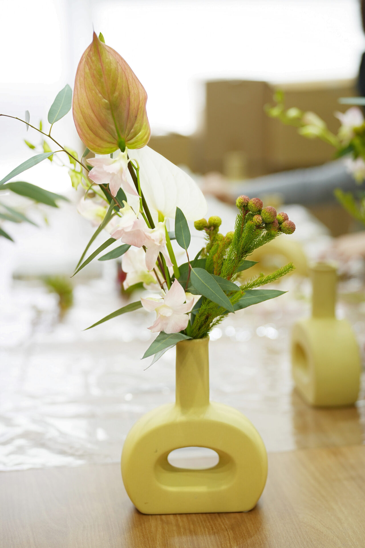 完成したアレンジメントは、4種類のお花の魅力が引き立つ、華やかで明るい仕上がりとなりました✨
