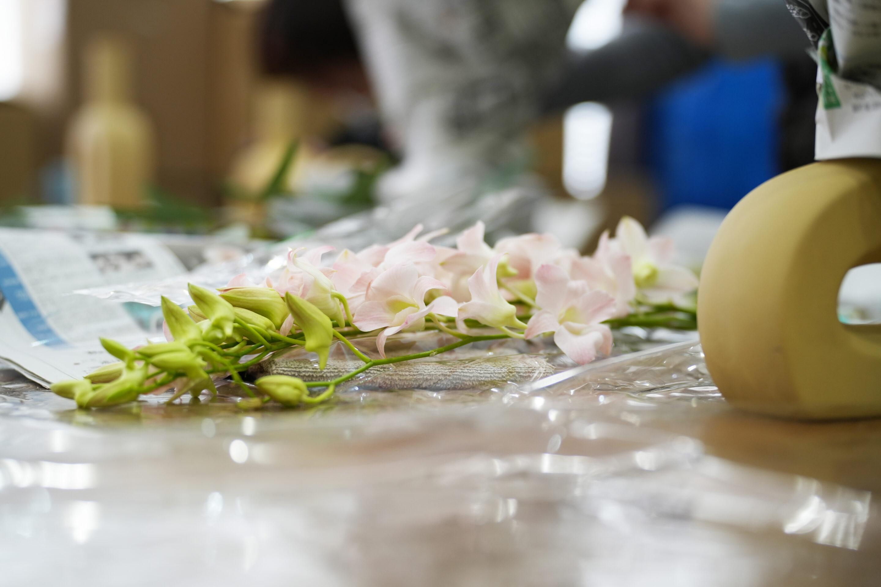 それぞれのお花の向きや高さを丁寧に整えながら、全体のバランスが美しく見えるよう慎重に配置していきました。位置を少し調整するだけでも印象が変わるため、仕上がりを確認しつつ作業を進めています🌸